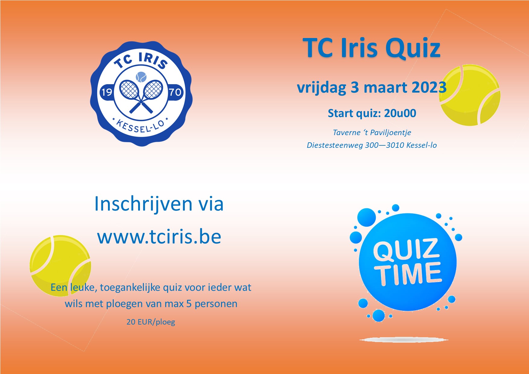 Tennis Club Iris organiseert op vrijdag 3 maart 2023 om 20 uur de ‘TC Iris Quiz’ in taverne ‘t Paviljoentje (Dieststeenweg 300 – Kessel-lo). Een leuke, toegankelijke quiz voor elk wat wils !